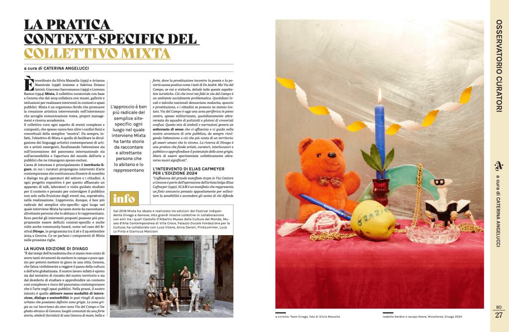 Divago è un festival di arte urbana ideato dal collettivo di curatela artistica Mixta e realizzato dall’Ass. Culturale ETS Wanda. Si svolge negli spazi pubblici e privati dell’ex ghetto ebraico di Genova, al cui centro si trova la celebre via del Campo. Nasce come festival indipendente con l’obiettivo di realizzare progetti di arte partecipativa in dialogo con le comunità locali e promuovere incontri e conferenze pubbliche a tema socio-culturale.