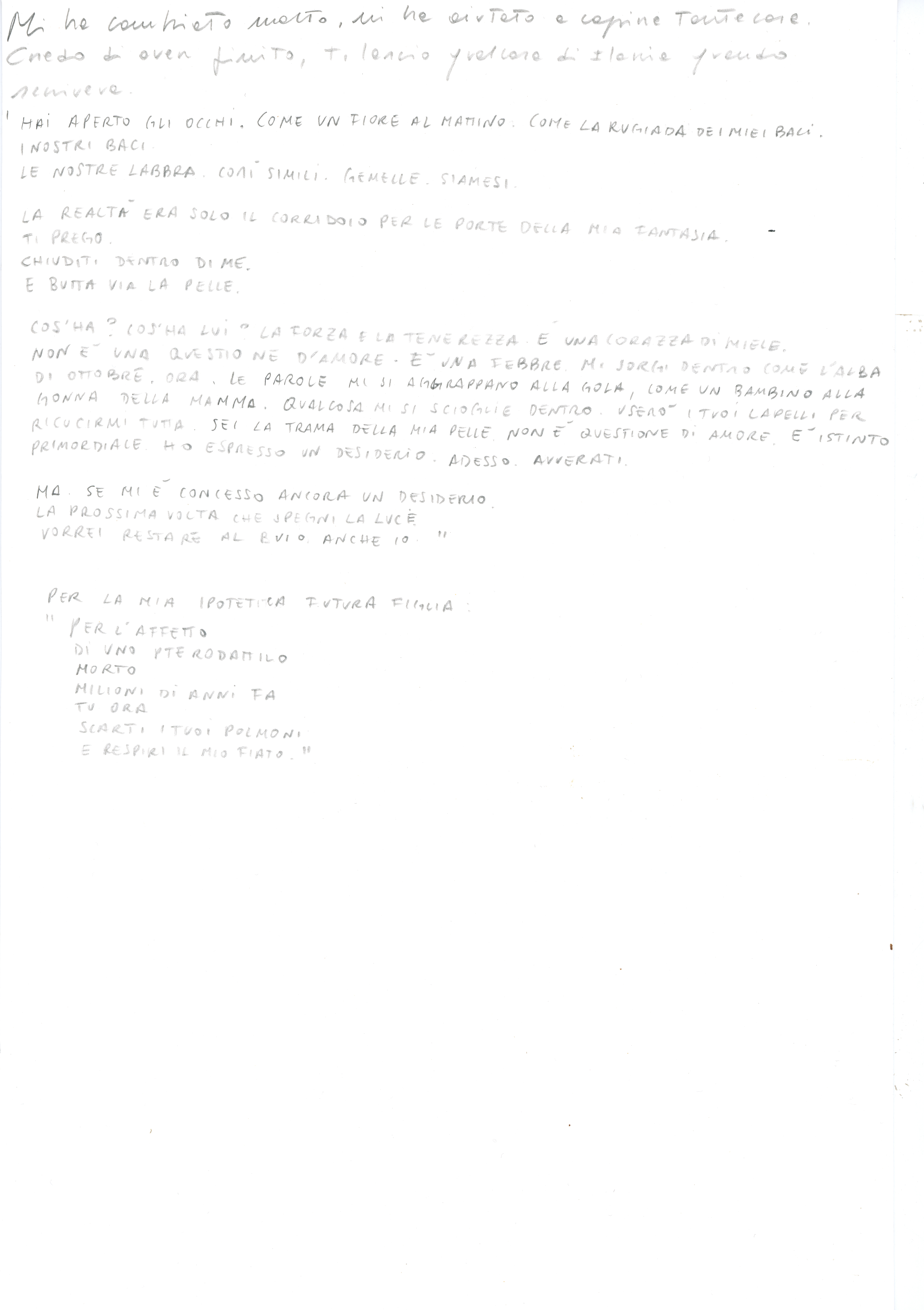 it is a short personal life dialogue that has given way to a series of connections and encounters. The phrase on which I focused is “she is__but it’s not you” together with the concept of perfection inserted in a popular loving language that leads to a clear distance emotional and social, between me and “the others women”.